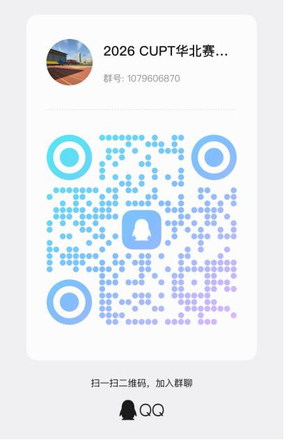 竞赛通知QQ群:欢迎各参赛高校裁判、领队、队员们加入QQ通知群,同时欢迎有意向观摩的高校教师加入,便于讨论交流。群名:2026 CUPT华北赛通知群,群号1079606870,也可用QQ扫描下方二维码进群。