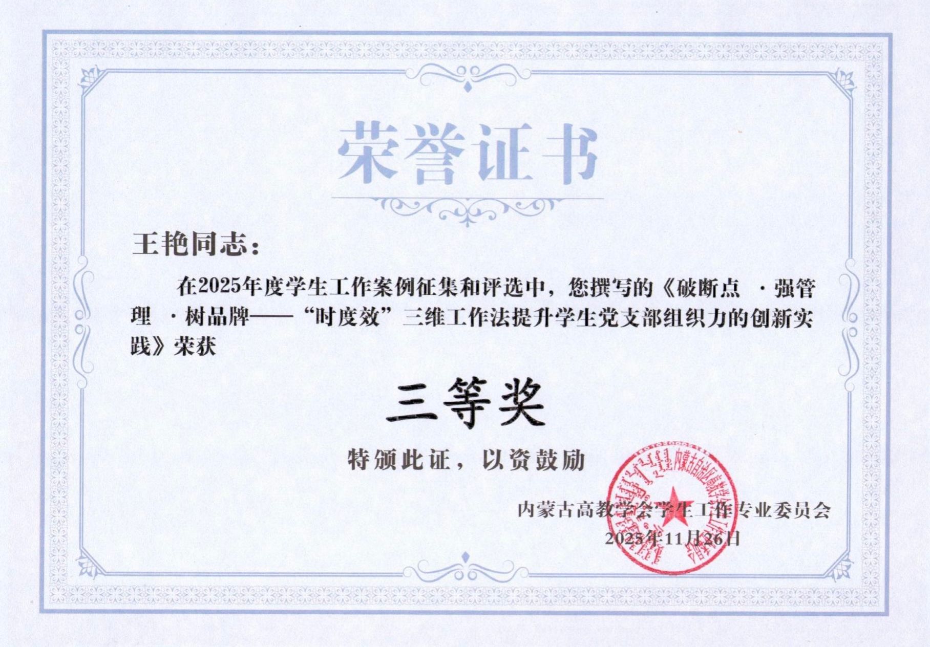 土木工程学院辅导员王艳的案例《破断点•强管理•树品牌——“时度效”三维工作法提升学生党支部组织力的创新实践》荣获三等奖。王艳的案例立足高校学生党建工作实际,以问题导向和目标导向为基本原则,聚焦提升学生党支部组织力这一工作重点,创新性探索“时、度、效”三维工作法,为破解当前学生党支部建设中的共性难题提供了可复制、可推广的实践路径。