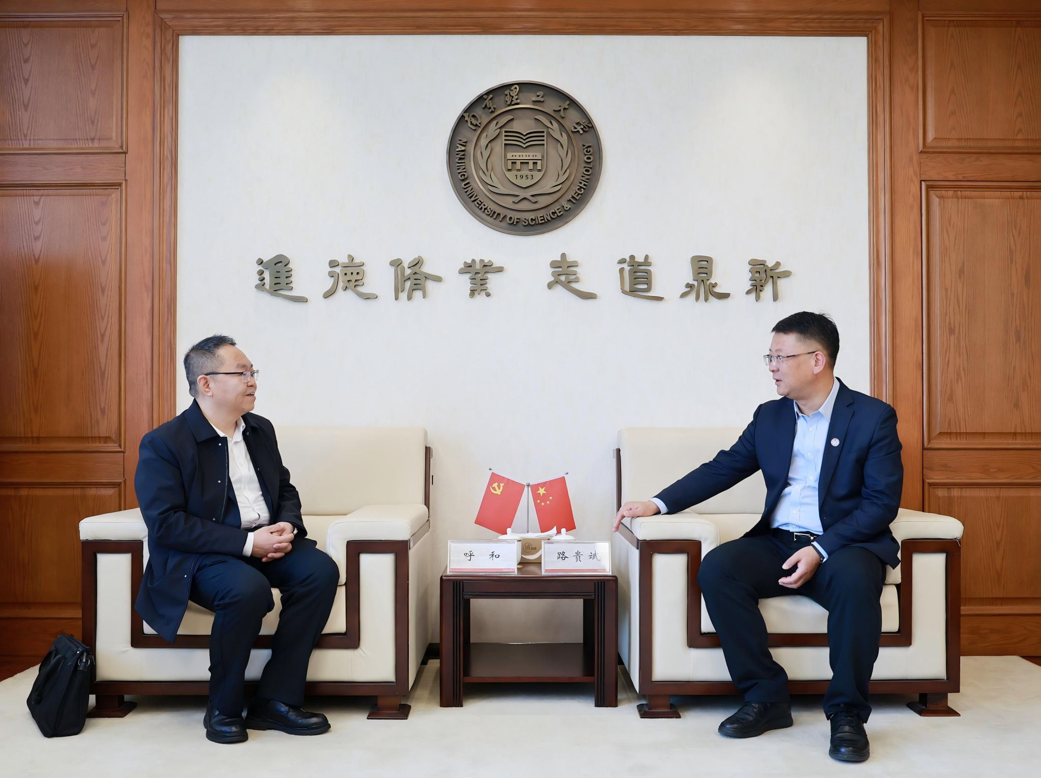 3月12日上午,呼和一行与南京理工大学党委书记路贵斌、副校长陈雄等学校领导和相关部门负责人座谈。