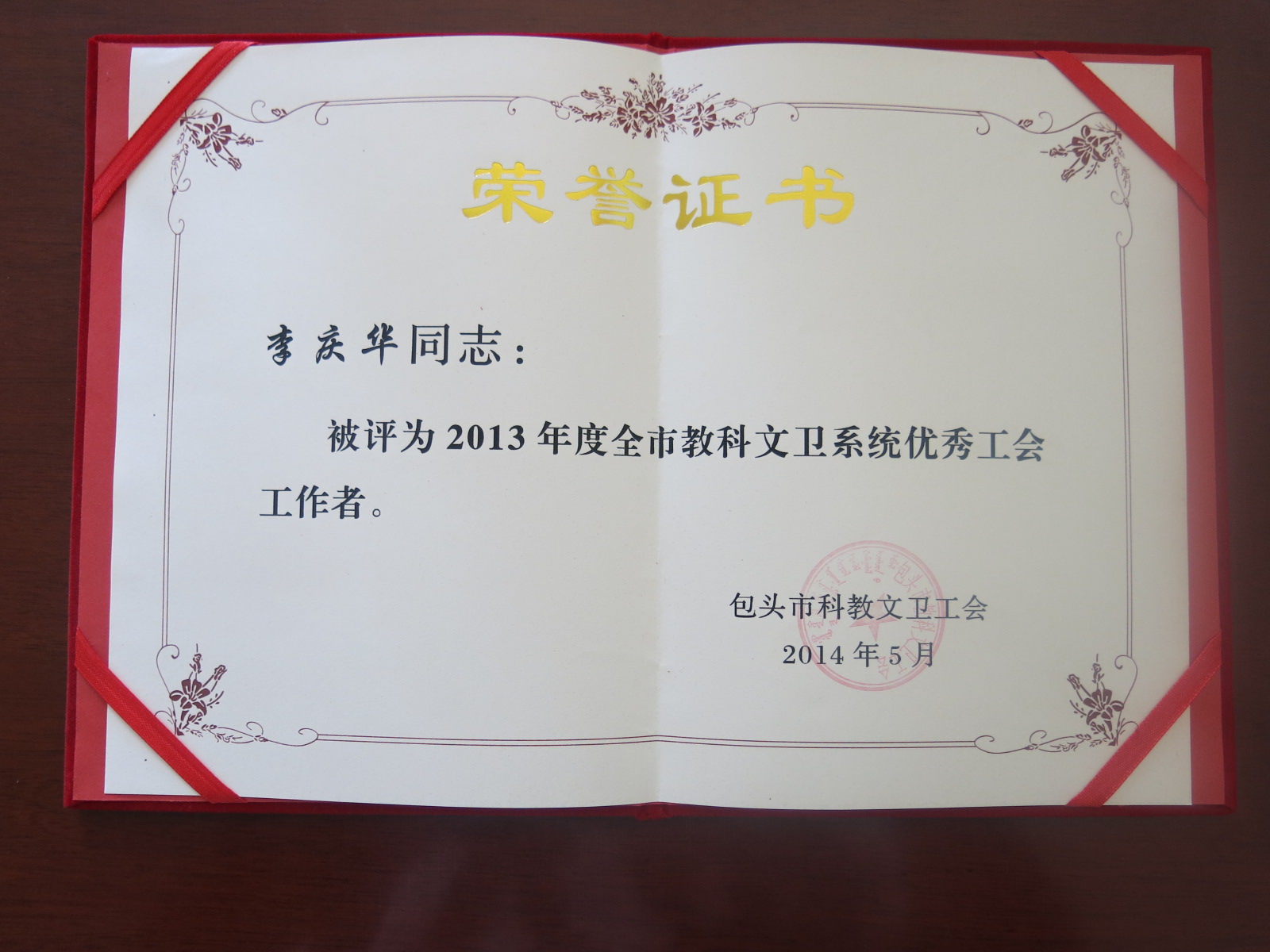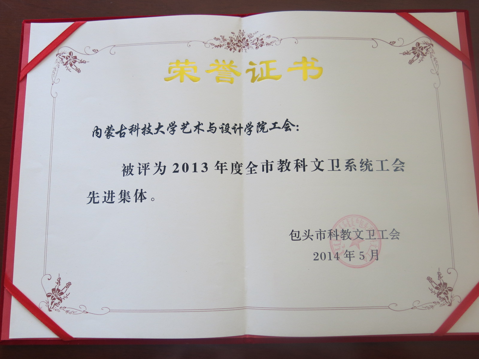 经过各级工会推荐,由包头市教科文卫工会评选,世界杯官网艺术与设计学院工会被评为2013年度全市教科文卫系统工会先进集体称号,校工会李庆华被评为2013年度全市教科文卫系统优秀工会工作者。