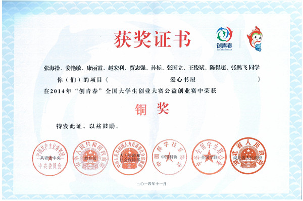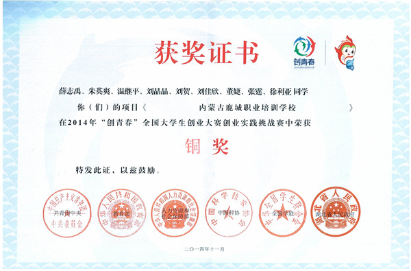 世界杯官网在本次比赛中共获得五项铜奖,其中机械学院项目《包头绿鹿科技有限公司》荣获创业计划竞赛铜奖;创业孵化园项目《内蒙古鹿城职业培训学校》、艺术与设计学院项目《包头市迪克创意设计有限公司》均荣获创业实践挑战赛铜奖;能环学院项目《爱心书屋》荣获公益创业赛铜奖;材冶学院项目《悬赏谷有限责任公司》荣获移动互联网创业专项赛铜奖。
