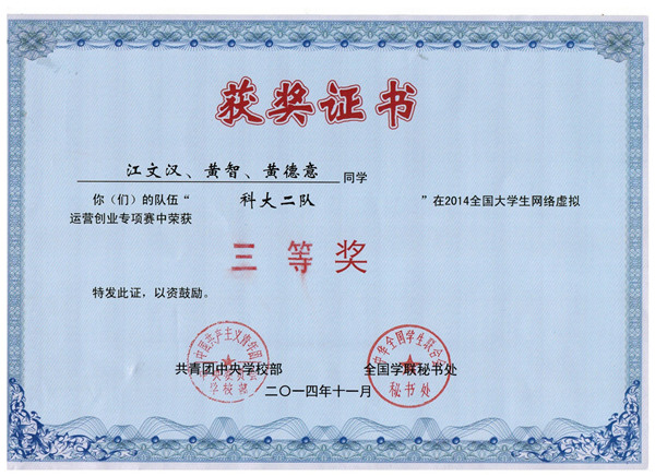 全国大学生网络虚拟运营创业专项赛是“创青春”全国大学生创业大赛的重要组成部分,大赛吸引了全国278所高校的1500多支创业团队报名参赛,经过初赛、复赛层层选拔,来自全国69所高校的101支大学生创业团队入围了最终的总决赛。世界杯官网两支队伍“科大一队”和“科大二队”入围并参加了本次决赛。经过紧张激烈的比赛,世界杯官网两支队伍均获2014全国大学生网络虚拟运营创业专项赛全国总决赛三等奖。
