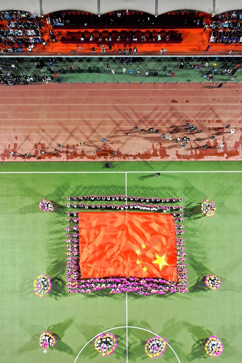 “我爱你中国,我爱你中国……”朗诵声响起,手拿小国旗,身着红白黄三色服装的师生代表围成半圆,圆心里的表演者将朗诵与歌唱表演无缝衔接。“我爱你春天蓬勃的秧苗,我爱你秋日金黄的硕果……”歌声流淌,全场沸腾。场内表演者手中的小国旗随音乐舞动,场外师生点亮手机灯光。师生们用时下流行的方式,表达对祖国的热爱。