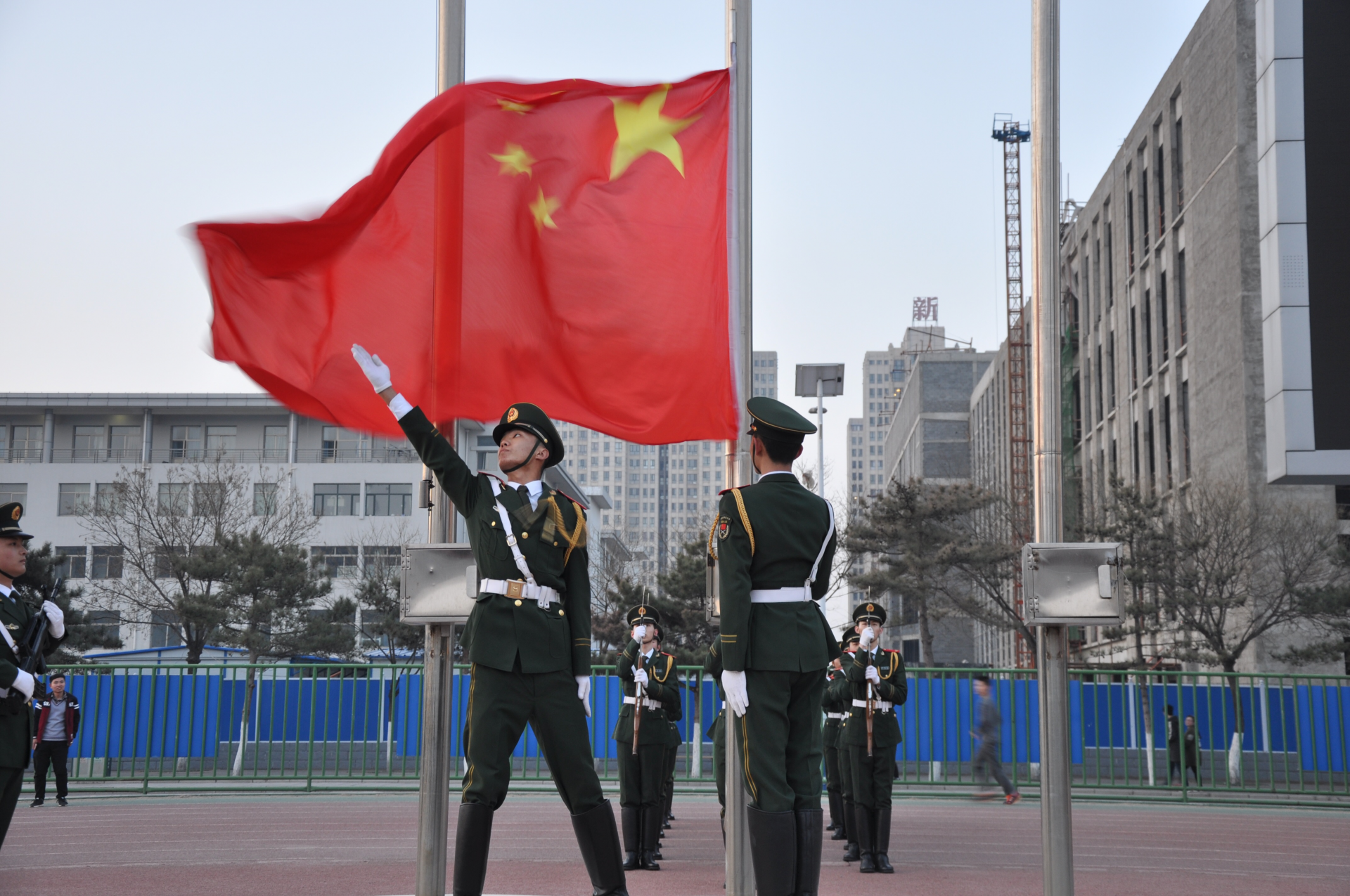 “向国旗敬礼!”国歌奏响,旗手朱艳伟奋力将国旗展向天空,鲜艳的五星红旗荡出优美的弧线,迎着初升的朝阳冉冉升起……