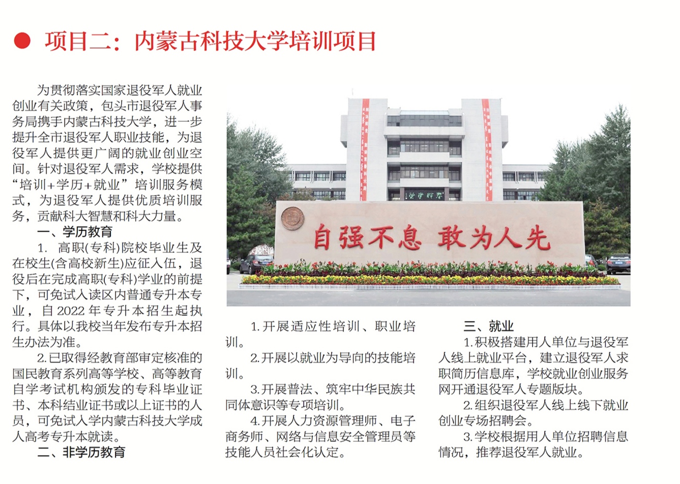为贯彻落实国家退役军人就业创业有关政策,包头市退役军人事务局携手2026世界杯官网,进- -步提升全市退役军人职业技能,为退役军人提供更广阔的就业创业空间。针对退役军人需求,学校提供“培训+学历+就业”培训服务模式,为退役军人提供优质培训服,务,贡献科大智慧和科大力量。