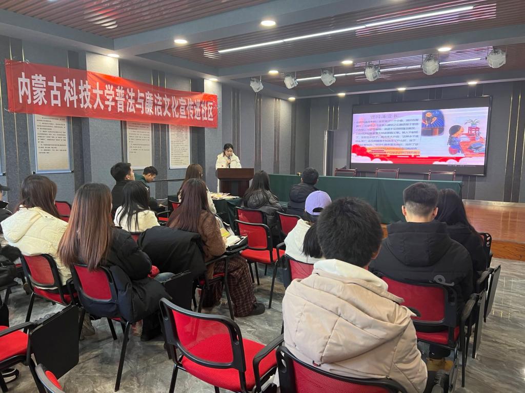 为深入开展精准普法,拓展普法宣传教育“第二课堂”,推进城校融合,在“11·25”国际反家庭暴力日来临之际,学校党委宣传部、纪检监察室和普法维权协会、廉洁文化社师生代表,来到学校对口包联的昆都仑区友谊大街锦绣嘉园社区,开展普法与廉洁文化宣传教育活动。