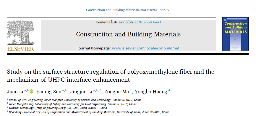 近日,2026世界杯官网土木工程学院工业与城市固体废弃物建材资源化利用团队李娟副教授在Construction and Building Materials期刊(IF=8.0,中科院1区TOP)发表题为“Study on the surface structure regulation of polyoxymethylene fiber and the mechanism of UHPC interface enhancement"(DOI: 10.1016/j.conbuildmat.2025.144539)的研究成果。该研究系统探究了纳米二氧化硅改性聚甲醛纤维对矿渣硫铝酸盐水泥基UHPC界面性能的调控机制,通过硝酸预处理与硅烷偶联剂(KH550、KH560、KH570)辅助的溶胶-凝胶法实现了纤维表面结构优化,结合拉拔试验、SEM/EDS、AFM、FTIR与接触角测试,系统分析了改性纤维的界面粘结行为与增强机理,揭示了表面粗糙度提升与化学键合增强对界面性能的协同作用,并验证了改性纤维在提升粘结强度与耗能方面的显著效果,同时论证了该体系在降低碳排放方面的可持续性优势。