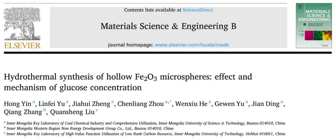 近日,世界杯官网化学与化工学院碳基能源清洁高效转化与低碳利用团队周晨亮副教授研究成果在MSEB上发表,相关研究成果以《Hydrothermal synthesis of hollow Fe2O3 microspheres: effect and mechanism of glucose concentration》为题,发表在《Materials Science & Engineering B》上。