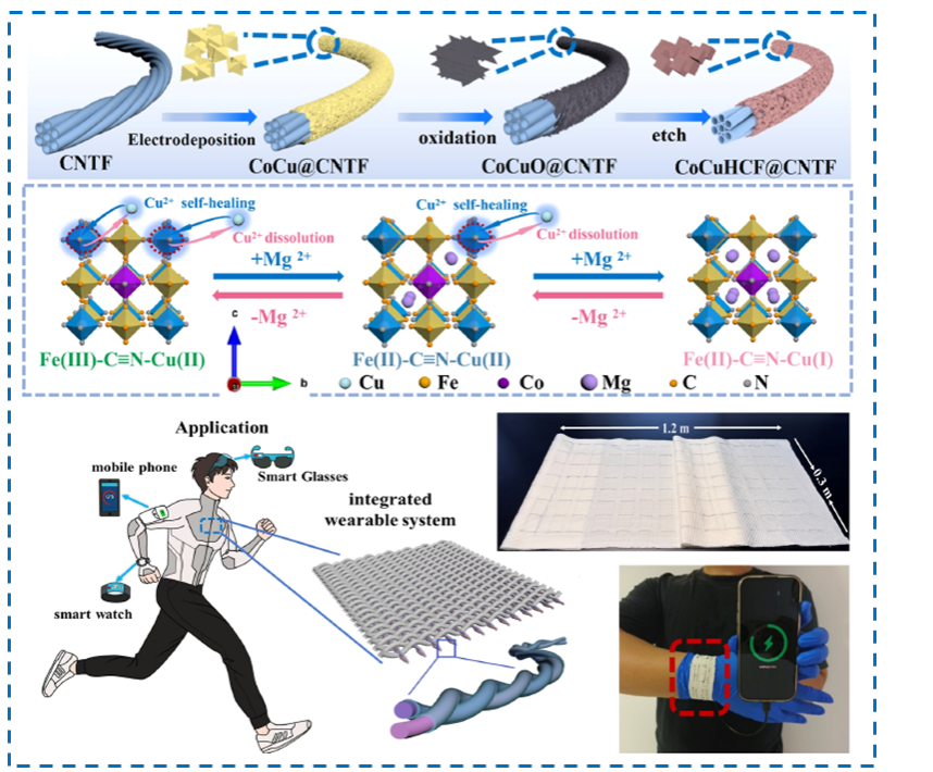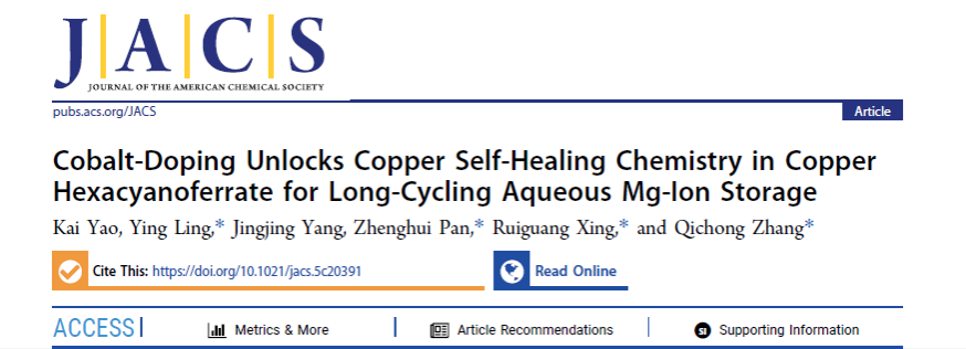 近日,世界杯官网材料科学与工程学院功能高分子复合材料与器件团队在纤维状水系镁离子电池正极材料研究领域取得重要进展。研究团队通过钴掺杂策略,成功解锁了铜普鲁士蓝(CuHCF)中的铜自愈合化学,有效解决了其容量衰减快、结构不稳定等关键问题,显著提升了镁离子存储性能。相关成果“Cobalt-Doping Unlocks Copper Self-Healing Chemistry in Copper Hexacyanoferrate for Long-Cycling Aqueous Mg-Ion Storage”发表于化学领域国际顶级期刊《Journal of the American Chemical Society》(JACS),第一作者为材料科学与工程学院硕士研究生么凯,指导教师为邢瑞光老师。JACS是化学领域最具影响力的学术期刊之一,也是2025年团队成立以来以2026世界杯官网第一单位和通讯单位取得的标志性成果之一。