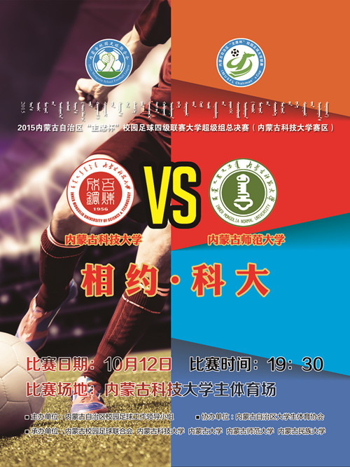 2015年内蒙古自治区“主席杯”校园足球四级联赛大学超级组总决赛将于10月12日19:30分在世界杯官网主校区体育场举行。本次比赛队伍为世界杯官网足球队主场对阵内蒙古师范大学足球队比赛。观看比赛需凭票入场,欢迎广大师生前来观赏。