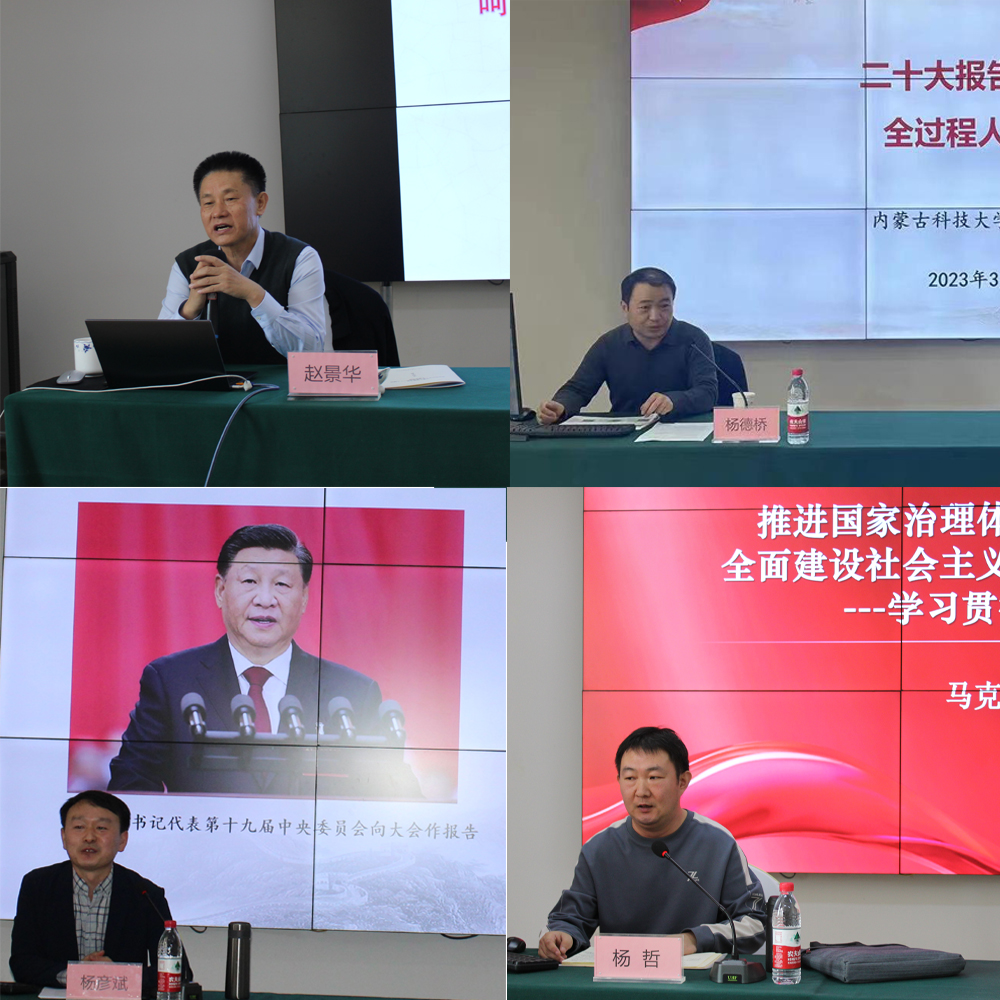 学习贯彻党的二十大精神自治区宣讲团成员、内蒙古社会主义学院副院长赵景华,文法学院教授杨德桥、马克思主义学院教授杨彦斌、副教授杨哲分别作《完整准确全面理解党的二十大精神、铸牢中华民族共同体意识、呵护内蒙古模范自治区崇高荣誉》《二十大报告视野下的全过程人民民主》《以中国式现代化推进中华民族伟大复兴》《推进国家治理体系和治理能力现代化在全面建设社会主义现代化国家重要作用》等专题辅导报告。