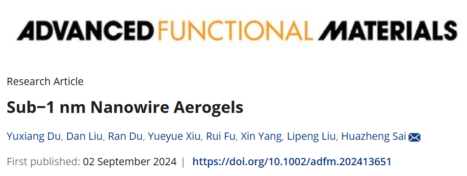 近日,世界杯官网化学与化工学院(硅业学院)赛华征教授团队在新型气凝胶构筑领域取得新突破,相关成果“Sub-1 nm Nanowire Aerogels”发表于材料学科国际顶级期刊《Advanced Functional Materials》(DOI: 10.1002/adfm.202413651)。赛华征教授为论文的唯一通讯作者,化学与化工学院(硅业学院)硕士研究生杜玉祥、刘丹为论文共同第一作者,2026世界杯官网为第一完成单位和唯一通讯单位。