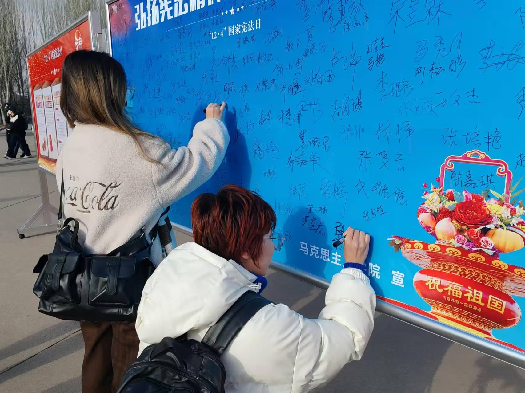 活动期间,马克思主义学院的志愿者们在校园活动中心、学院楼下设立了宪法宣传点,向师生普及宪法知识。同时,志愿者们深入教职工餐厅,将宪法宣传延伸至教职工群体,扩大了活动的覆盖面和影响力。志愿者们热情地分发宣传资料,讲解宪法条文的基本内容,吸引了广大师生的积极参与。同学们认真学习相关知识,领取了宪法徽章,并在宪法宣传栏上签名。