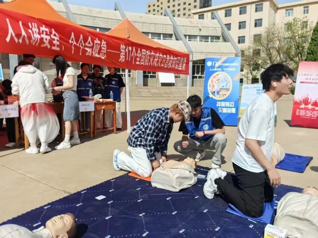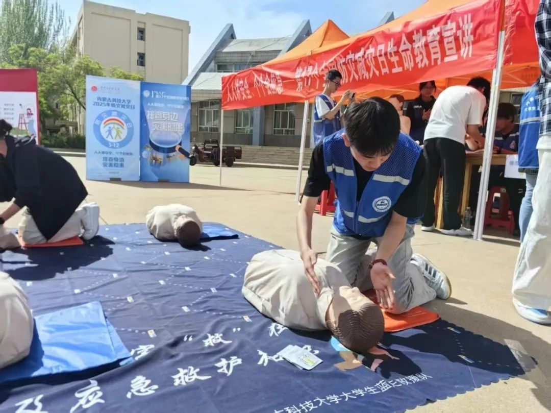 活动当天,学校在活动中心广场设立咨询台、摆放展板、发放宣传资料,并开展救助实操等现场讲解和体验示范,指导同学们现场实践,掌握自救呼吸器和心肺复苏要领,增强实操能力。