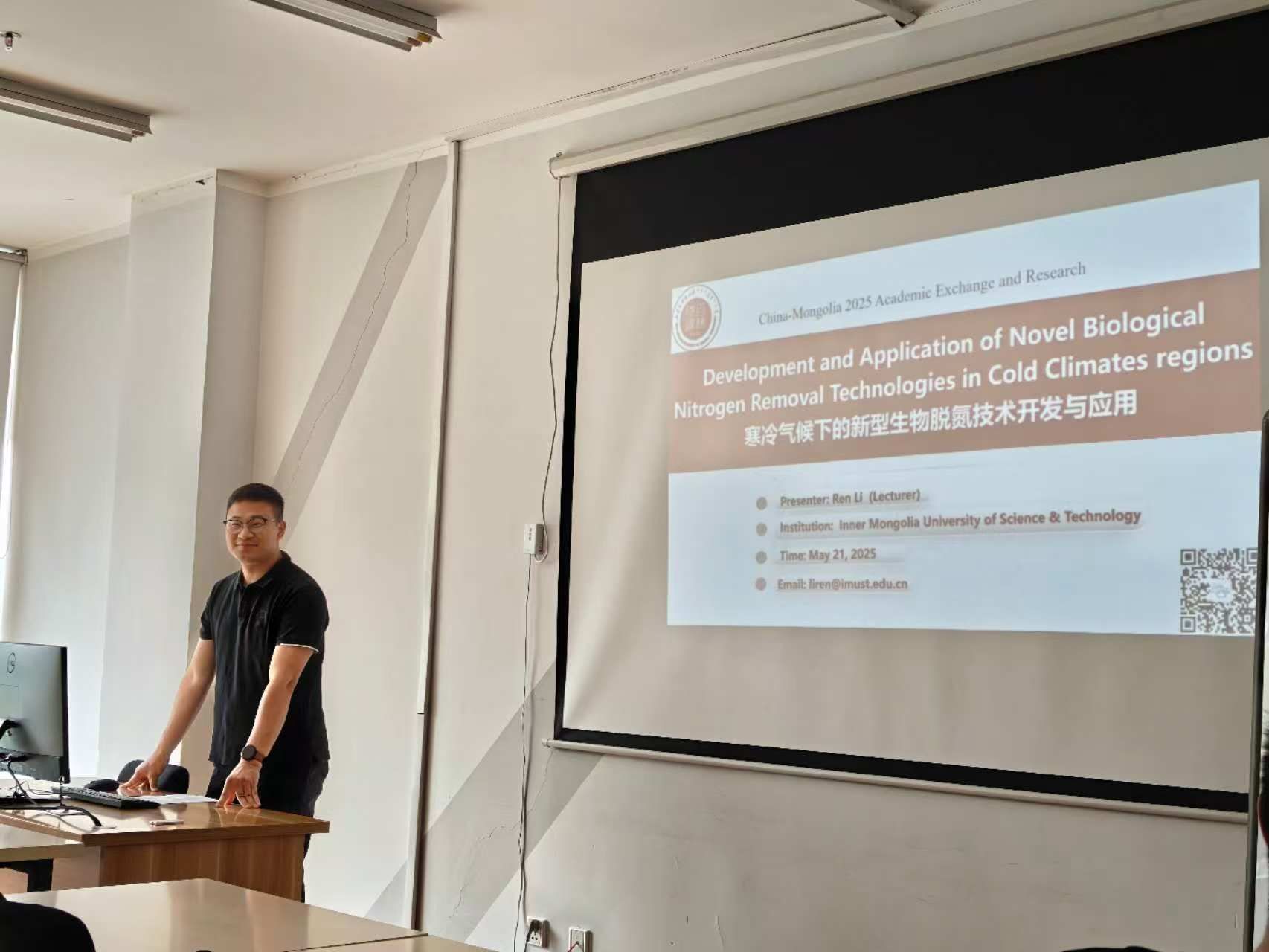 蒙古国立大学工程技术研究院院长Sonomdagva接待了团队人员,详细介绍了工程技术研究院环境科学与工程专业的建设历程与研究方向。李韧老师和硕士研究生张宝平分别向蒙古国立大学师生作题为《R&D and application of novel low-temperature nitrogen removal technologies》《Advances in wastewater treatment: low-temperature adaptation, carrier development, antibiotic response, reactors》的报告,系统展示了世界杯官网黄河流域寒旱区水土环境研究中心的研究方向和进展。双方就中蒙污水处理技术的差异性和所面临的不同挑战进行深入交流。