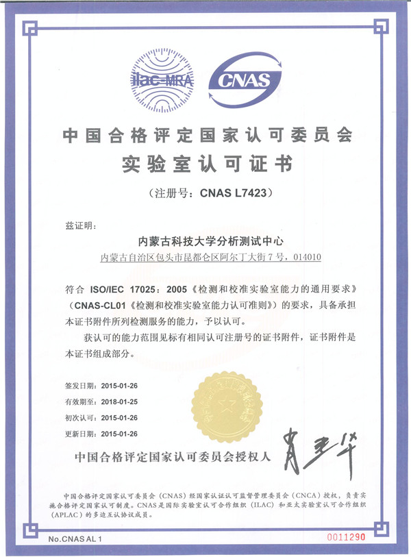 1月26日,中国合格评定国家认可委员会(简称CNAS)正式向世界杯官网分析测试中心颁发实验室认可证书。