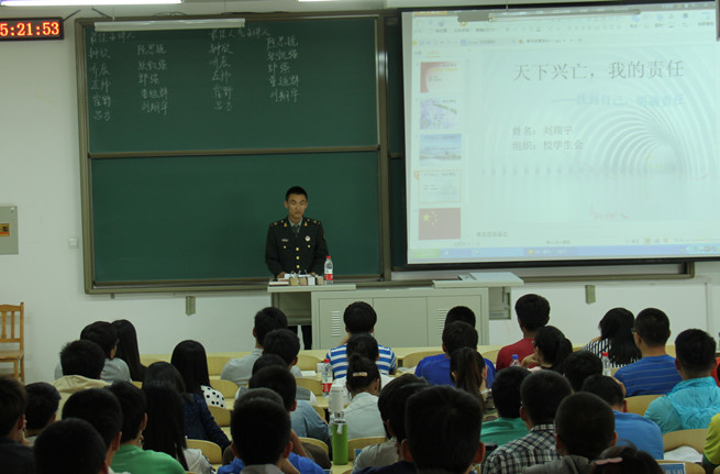 本次论坛共安排10名同学参讲,他们分别从维护国家形象的责任与义务、中国军魂、我爱我的国与家、天下有我从小做起,完善自我、明确责任等方面,阐述了自己在当代大学生在祖国建设中应具有的自强意识、爱国意识和责任意识中的认识和体会。其间,宣讲学员带来的诗朗诵——《我骄傲,我是中国人》感人至深,将论坛推向了高潮。