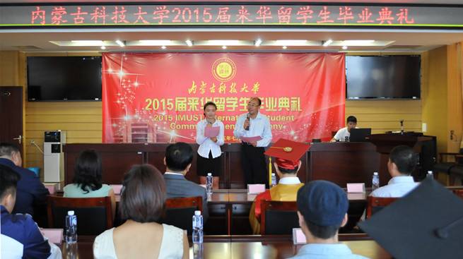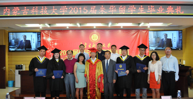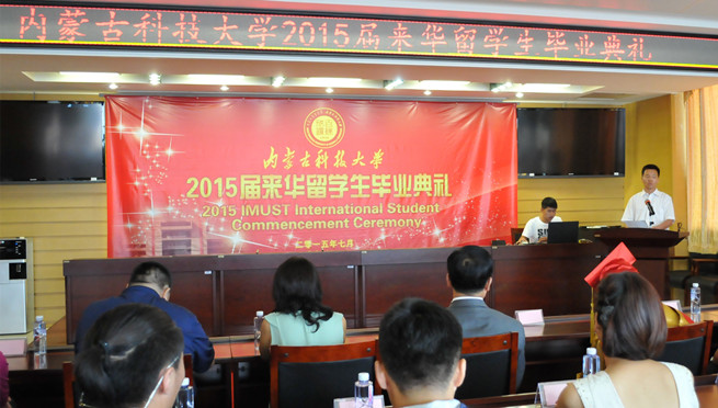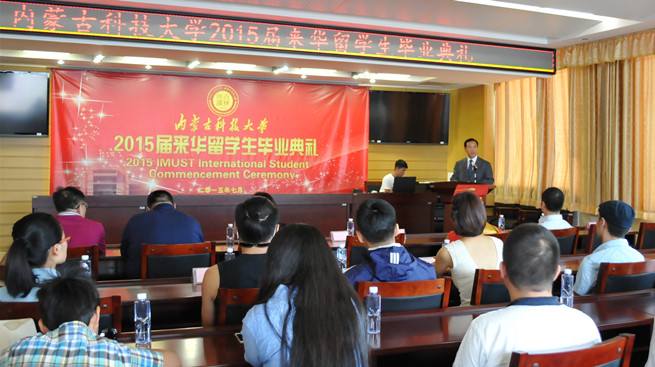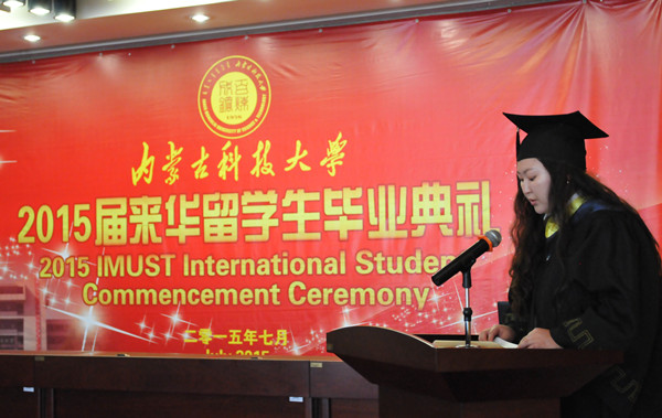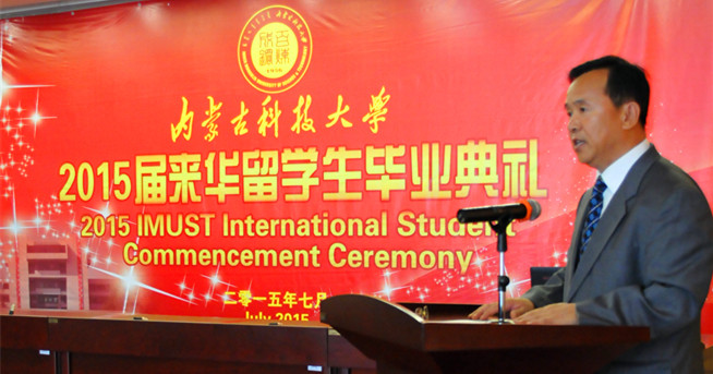 李国雄代表学校致辞。他首先向圆满完成学业的2015届来华留学生表示热烈的祝贺,向为同学们默默付出、辛勤耕耘的老师和管理人员,向关心和支持世界杯官网留学生教育发展的各级领导和有关部门表示由衷的感谢。他对留学生们提出殷切希望,希望他们回国后为自己的国家建设做出应有的贡献;希望他们回国后继续发扬世界杯官网优良传统,以优异的成绩回报母校和老师的培养,同时将中国近年来的飞速发展,在包头、在科大的所见所闻告诉家人和朋友,让更多的人了解世界杯官网,为中外友谊贡献自己的一份力量。