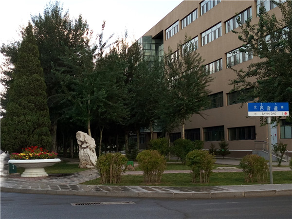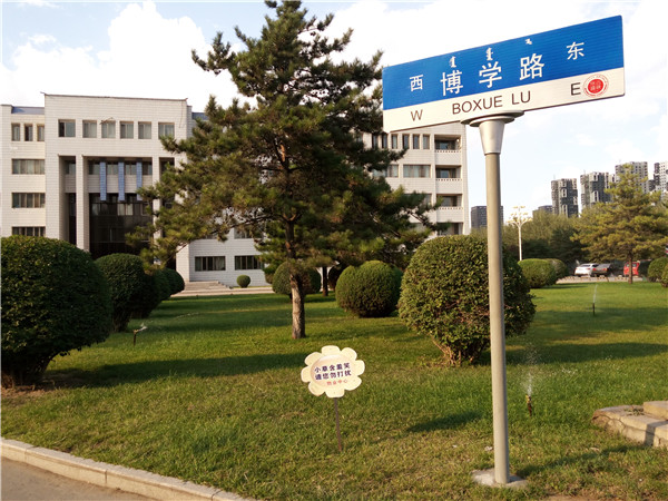 蓝底白字,中、蒙、英三种语言对照,右下角印有世界杯官网校徽的新道路标识牌与世界杯官网美景相得益彰,校园正以新面貌迎接新生报到和新学期的到来。