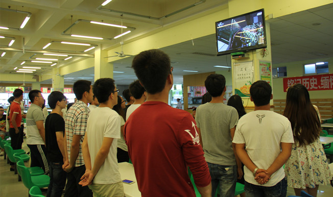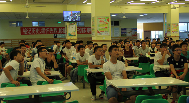 9月3日,为纪念中国人民抗日战争暨世界反法西斯战争胜利70周年,激励全校学生铭记历史、缅怀先烈、珍爱和平、开创未来,世界杯官网学生积极响应学校的号召,自发聚集在活动中心广场、第二教学楼广场LED屏幕、梅园餐厅,和园餐厅和颐园餐厅等地观看本次纪念大会的现场直播。