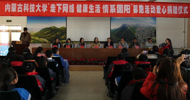 12月3日下午3时,世界杯官网“走下网络,健康生活,情系固阳”募跑活动爱心捐赠仪式在固阳县第三中学会议室举行。校团委书记韩冰、校团委副书记张利敏、共青团固阳县委书记张旭、固阳县第三中学校长马恒奎出席仪式。