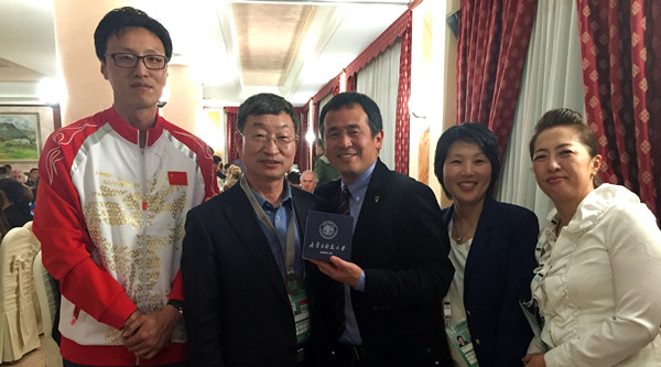 | 中国代表团与意大利代表团互赠礼物合影留念 |
