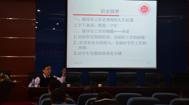 在11月9日的讲座中,学生工作委员会于海平教授以《我的职业我的梦》为题,以一个老学工人的角度,分享了自己对于对辅导员这个职业的认识、体会、感悟,并结合教育部《辅导员职业能力标准》,对辅导员自身职业定位、职业发展提出个人的简介,并激励所有辅导员以此为标准,不断学习、完善知识,提升自己。