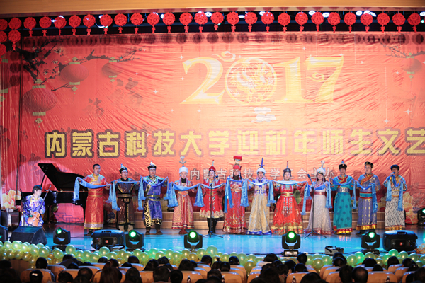 晚会在优美的歌声中圆满落幕。校领导与演职人员一起合影留念。