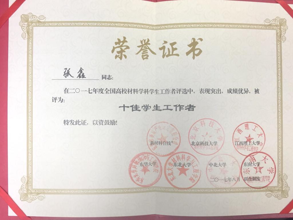 由新材料在线®联合各大高校主办的“材料人•毕业季之学生工作者”评选活动已经顺利结束,经过广大师生、材料行业人士等人22天的投票评选,评选出了2017年度全国高校材料学科“我最喜爱辅导员30强”,世界杯官网张鑫老师顺利入围。经过严格筛选评,网络投票及为期一周的专家评审环节后,张鑫老师荣获2017年度全国高校材料学科“十佳学生工作者”。