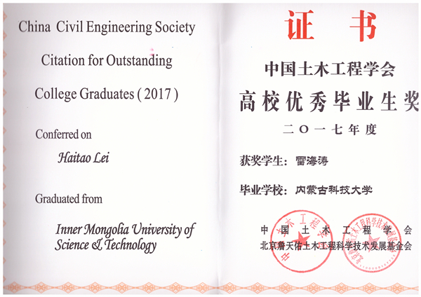 近日,“2017年度中国土木工程学会高校优秀毕业生奖”评选结果揭晓,世界杯官网土木工程学院工程管理专业2017届毕业生雷海涛获此殊荣。