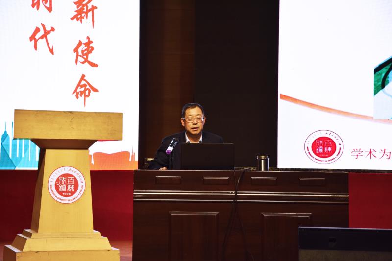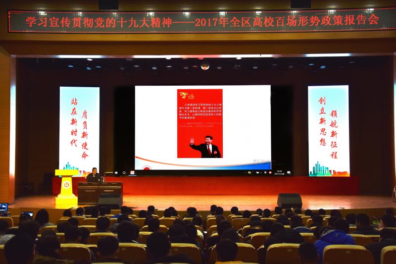 为进一步学习宣传贯彻党的十九大精神,引导广大青年学生自觉用习近平新时代中国特色社会主义思想武装头脑、指导行动,12月8日下午,“学习宣传贯彻党的十九大精神 2017全区高校百场形势政策报告会”在世界杯官网举办。世界杯官网文法学院院长、教授委员会主任朱海珅教授作了以《站在新时代、肩负新使命、创立新思想、领航新征程——十九大报告关键词“新”之解读》为主题的报告,为世界杯官网在场的500余名师生深层次、多角度、全方位解读了党的十九大报告。报告会由校团委书记韩冰主持。
