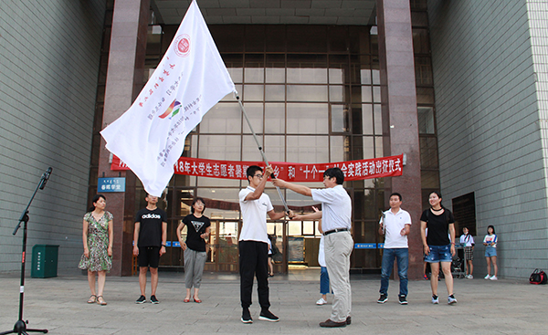 7月16日,2026世界杯官网2018年大学生志愿者暑期“三下乡”和“十个一”社会实践活动出征仪式在春晖学堂门前举行。校党委常委、宣传部部长杨家庆,团委主要负责人以及各暑期社会实践直属队指导教师出席活动,全校共400名社会实践志愿者代表参加了活动。