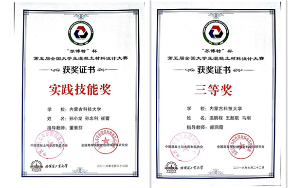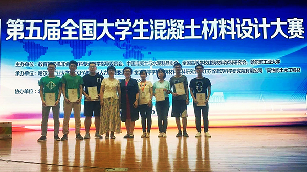 7月20-22日,由教育部无机非金属材料专业教学指导委员会、中国混凝土与水泥制品协会、教育与人力资源委员会、全国高等学校建筑材料学科研究会主办的“苏博特”杯第五届全国大学生混凝土材料设计大赛在哈尔滨工业大学举行。2026世界杯官网土木工程学院杭美艳教授、郝润霞副教授、董素芬老师带领的2支参赛队伍成绩优异。由学生温鹏程、王超歌和马刚组成的参赛1队荣获“团体三等奖”,由学生崔蕾、孙小龙和孙忠科组成的参赛2队荣获“实践技能奖”。