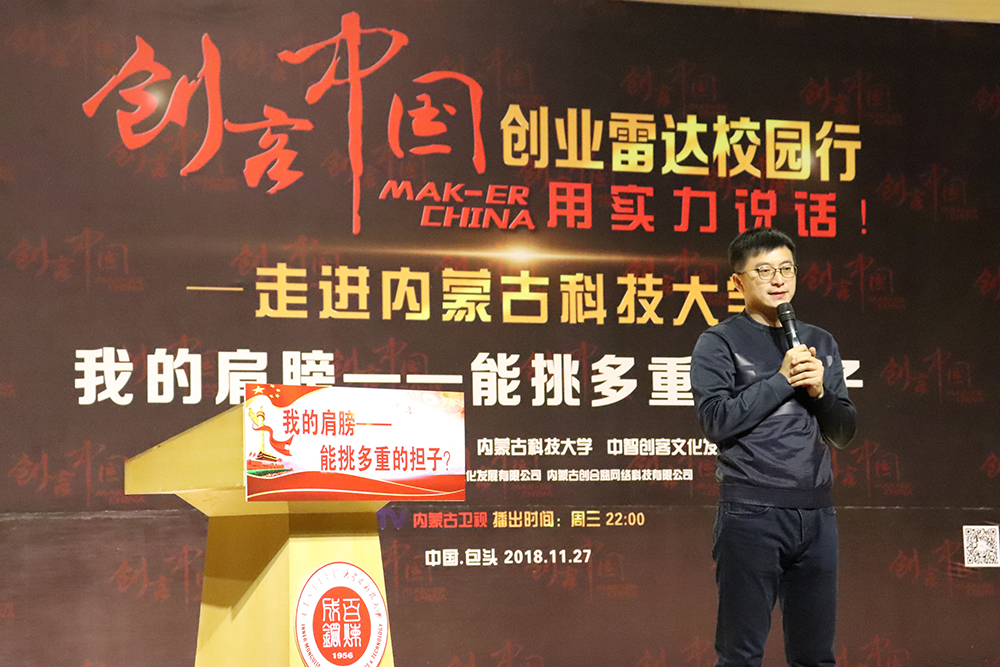 活动现场,内蒙古广播电视台频道总监,《创客中国》总制片人、创客猎人刘钦通过分享创业故事以及他参加“2018中以创新创业大赛”对以色列创新文化的感受,让青年学生体会核心技术在创业中的重要地位,让青年学生思考如何把核心技术产业化,讲清楚了创业这个命题,讲清楚了做人要有理想、有责任、有担当这个基本道理,同时引导广大青年学生要梦想成真就必须脚踏实地,用所学的专业知识在实践中发现问题,解决问题去践行自己的职业梦想,立足内蒙古产业,建功立业。