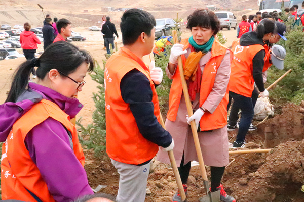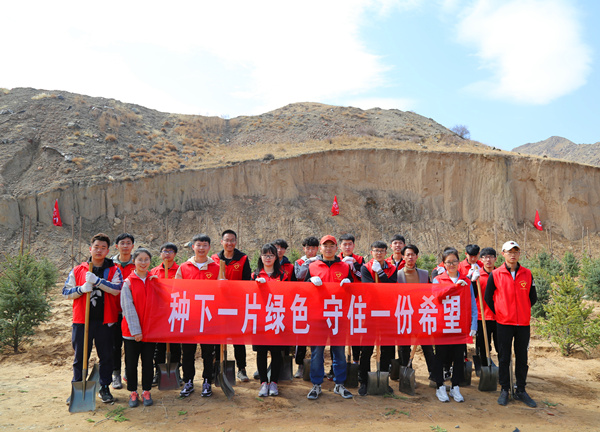 植树地点位于石门风景区,一到植树现场,大家就拿起自带的铁锹、手套等劳动工具,自行分组开始忙碌。身穿志愿者服装的老师同学们挥锹铲土、扶苗定植、两两配合,远远看去一片繁忙有序的劳动景象。付出一分辛苦,收获一份希望。经过大家的辛勤劳动,100余棵树苗迎风而立,师生纵情挥洒汗水,脸上绽放欣慰笑容。