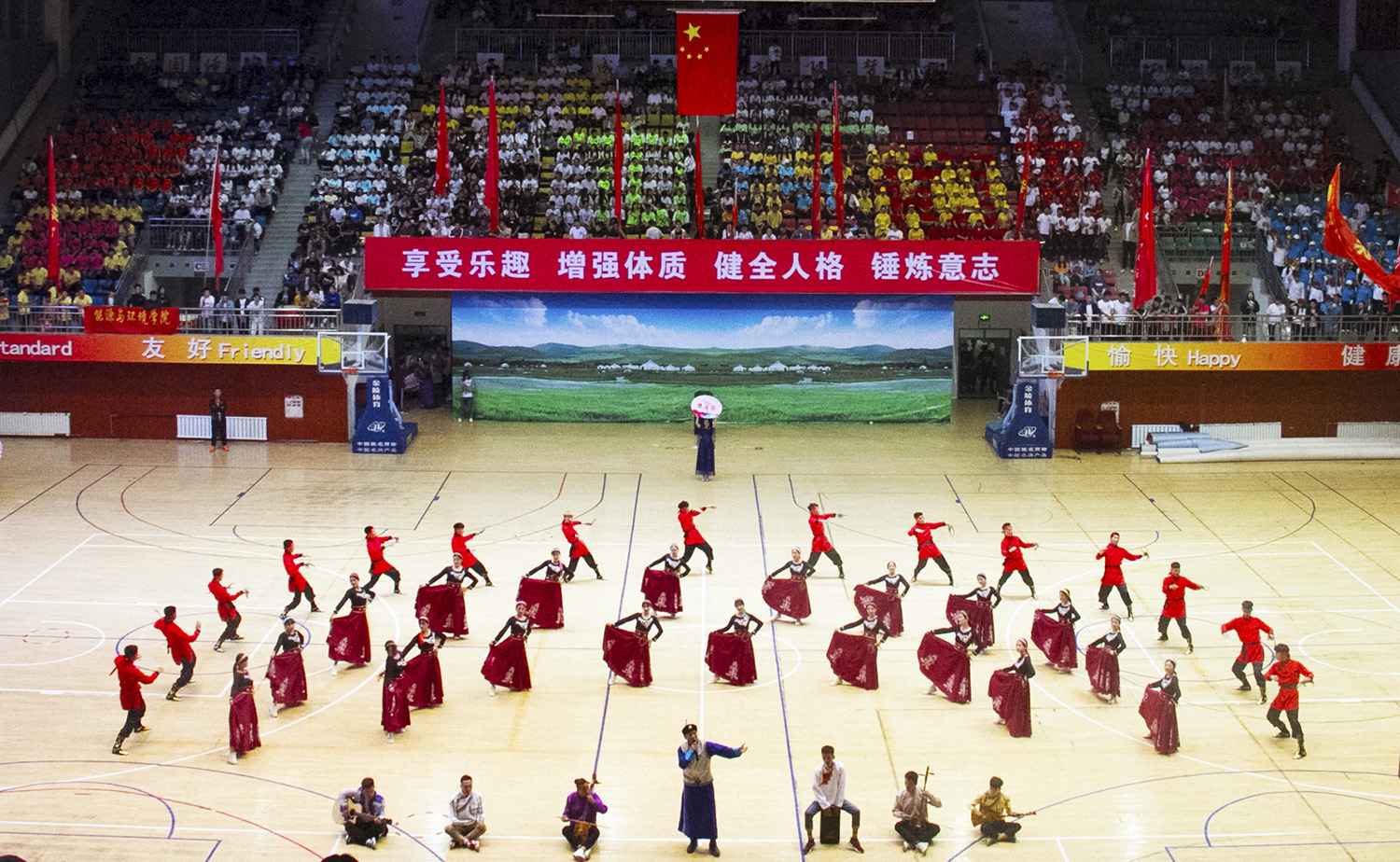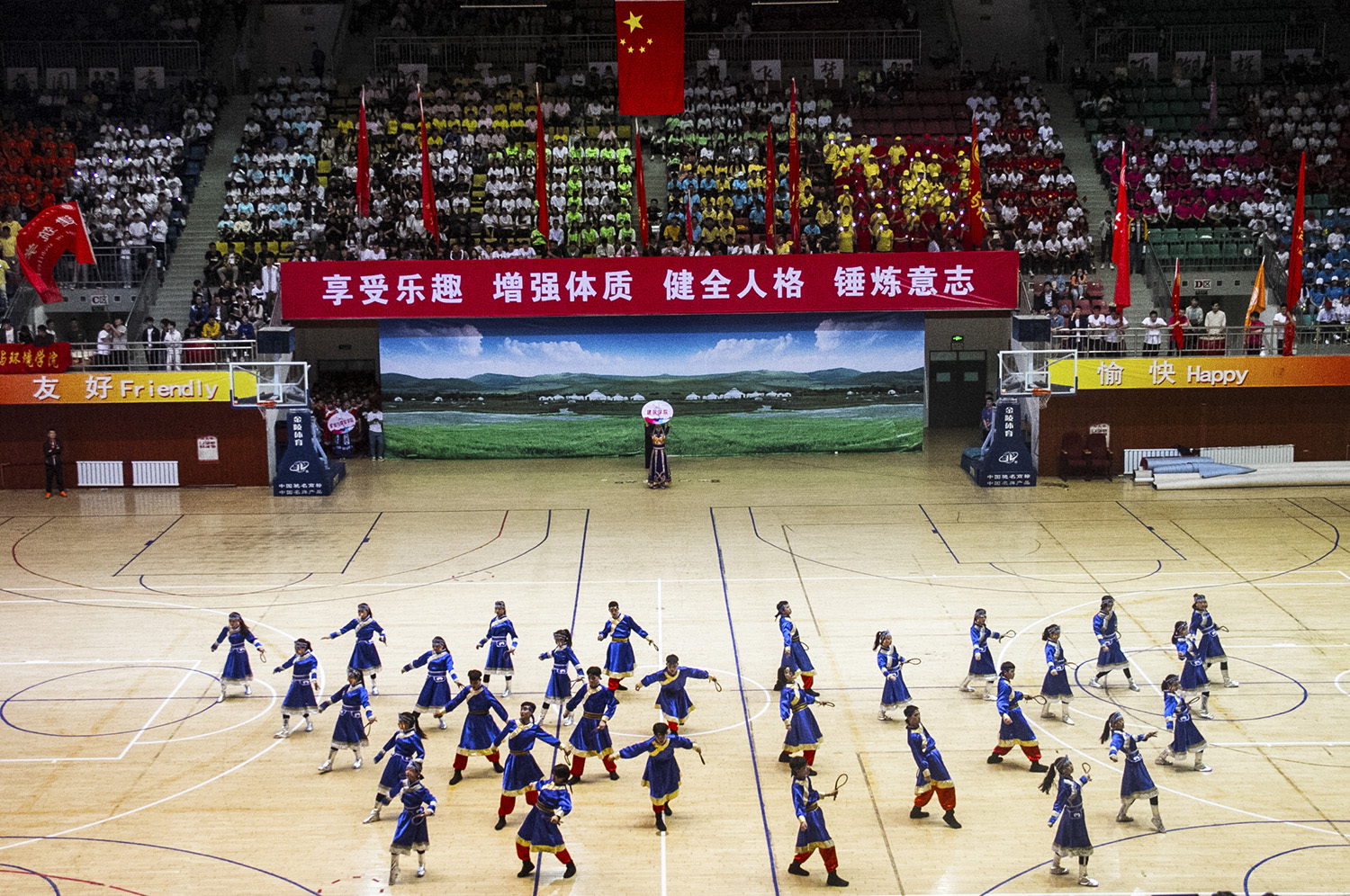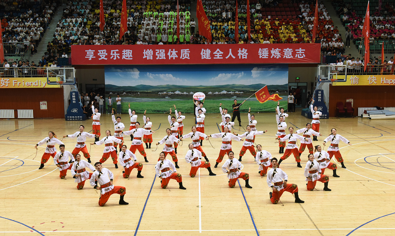 比赛在激昂的开场舞中拉开序幕,参赛队伍及裁判员依次入场。雄壮的国歌声响起,全场起立,面向国旗行注目礼。