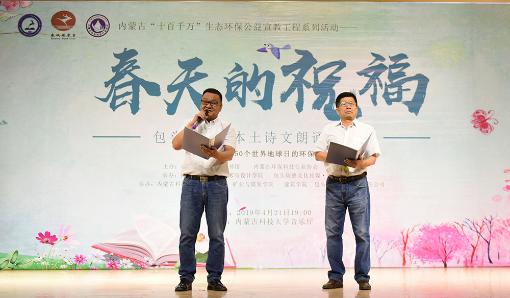 图书馆和文法学院18位师生集体朗诵特别创作的散文诗作《悦读,请到图书馆来》、《一路书香,一路阳光》、《春天的故事》,以最真挚、最热忱的情感向全校师生及包头市民发出爱读书、爱图书馆、爱净化心灵、爱生态环保的呼唤,引发现场师生和观众的强烈共鸣。