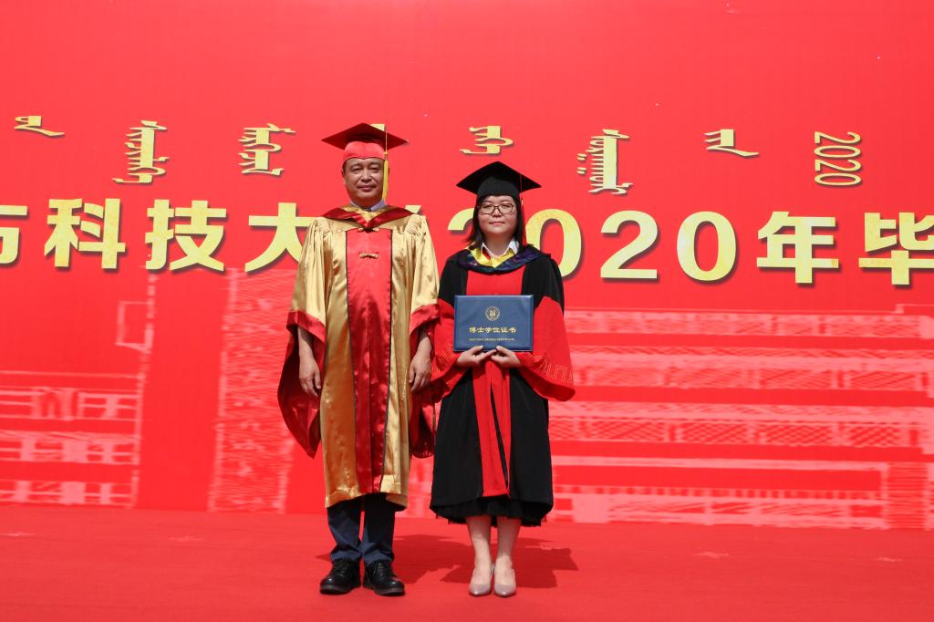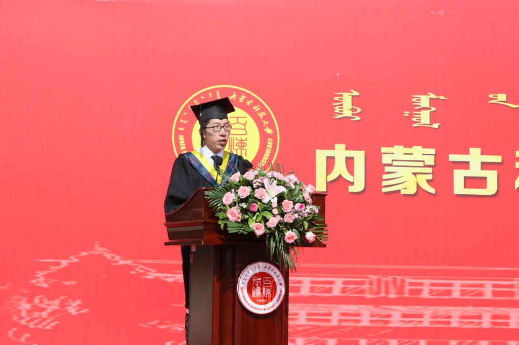 2020届毕业生代表、能源与环境学院李志新发言:阴山南麓黄河旁,文馨书院春晖堂,鹿鸣呦呦书声朗,穹庐天下品学尚。别了,科大!我们永远不会忘记心底的热爱与热泪盈眶的感动。感谢科大给我们更加有力的翅膀去翱翔天际。毕业之后,我定将继续秉承科大“自强不息、敢为人先”的校园精神和“百炼成钢”的校训,驶向更广阔的天空!