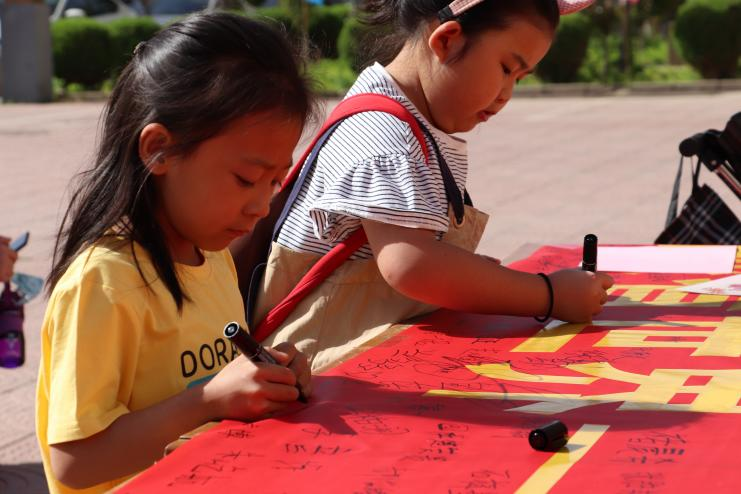 6月1日上午,在图书馆东门广场举行了开幕仪式,前来参加活动的青年教工和子女在横幅上签名,共同完成了“桃花朵朵开”、“家长比划孩子猜”等游戏。图书馆工作人员在圆弧大厅安排了淘宝大卖场活动,在学术厅全天播放经典儿童影片。