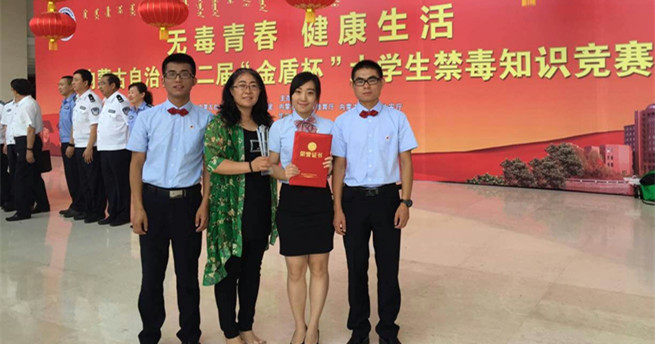 6月15日,由自治区禁毒办组织发起,主题为“无毒青春、健康生活”的自治区第二届“金盾杯”大学生禁毒知识竞赛在内蒙古电视台演播大厅举行。世界杯官网文法学院教师李富栋、学生刘忠秀、刘通组成的代表队荣获二等奖。