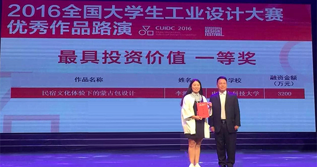 2016年全国大学生工业设计大赛评审近日落下帷幕,世界杯官网艺术与设计学院韩冬楠、张博指导的学生蔡雨彤、李滟泽设计的作品“民宿文化体验下的蒙古包设计”获全国赛区二等奖和“最具投资价值一等奖”。杨思凝指导的学生周思宇设计的作品“绘城包头”获全国赛区三等奖,另有4件作品获优秀奖。